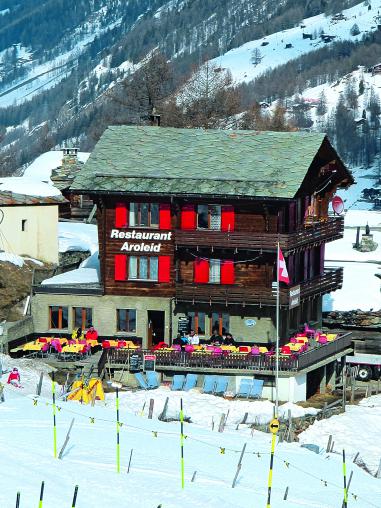 Croûte au fromage Aroleid, viande valaisanne séchée, fromage de montagne et choix de gâteau fraîchement préparés tous les jours. Rösti variées avec Schüblig ou Bratwurst, fondue au fromage, différentes omelettes.
